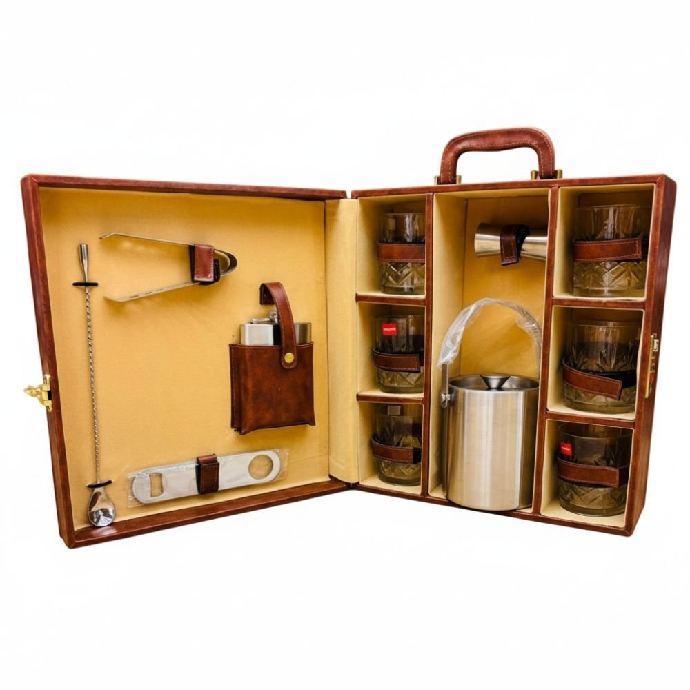 • Comprehensive Bar Accessories: Complete set of essential bar tools neatly organized within the box, such as hip Flask, Bar Blade, Jigger, Cocktail Shaker and ice Tong providing convenience for all your mixing and serving needs.