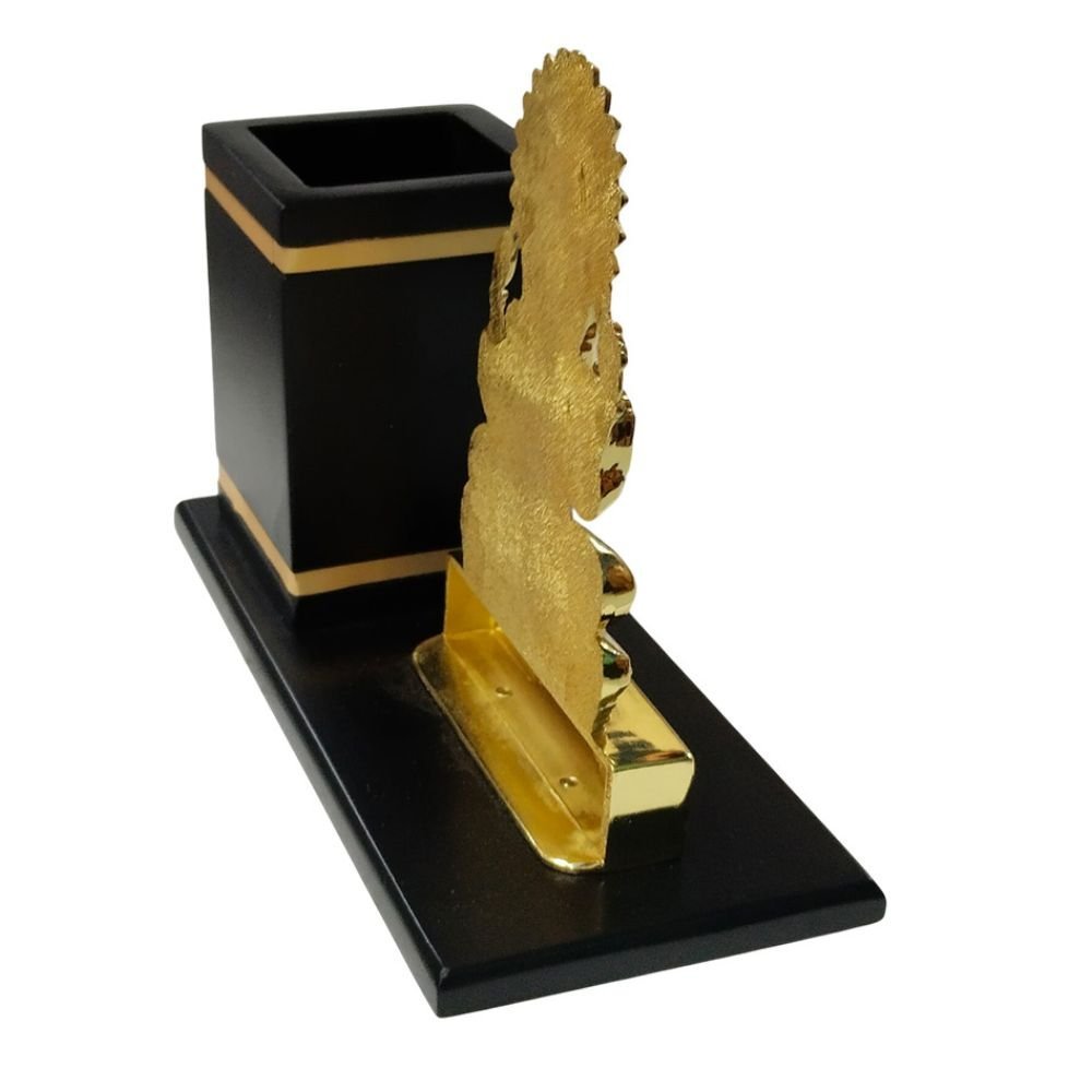 The finely detailed Lord Ganesha idol symbolizes wisdom, success, and good fortune, making it perfect for professional environments. The built-in analog clock helps you keep track of time, while the pen stand ensures a clutter-free workspace. Its sleek black base with gold accents adds a sophisticated touch to any office or home desk.