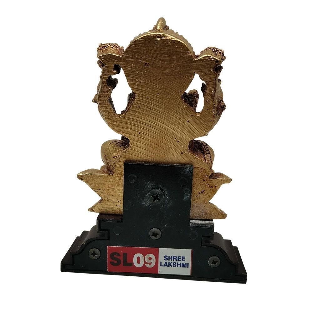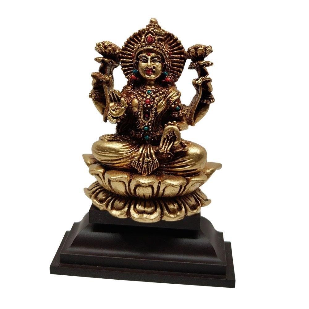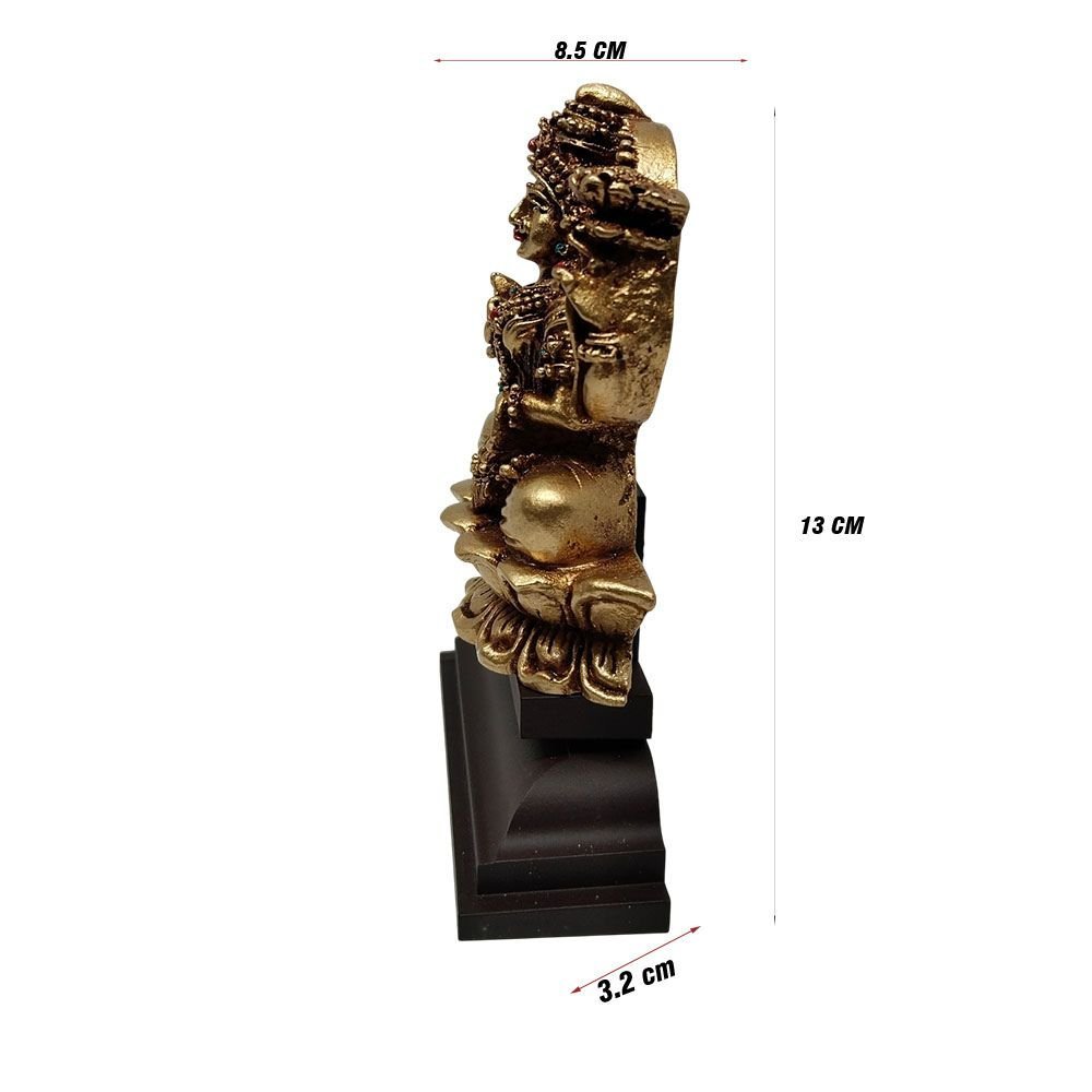 This graceful sculpture of Sri Lakshmi Thayar is beautifully handcrafted on Fine Fibre Material with Golden Finish size of about 5 inches height, Sri Lakshmi seated on a Lotus Pedestal to place on Table Top safely as a special Decorative showpiece to get a divine feel at Home / workplace Décor and Pooja worship.